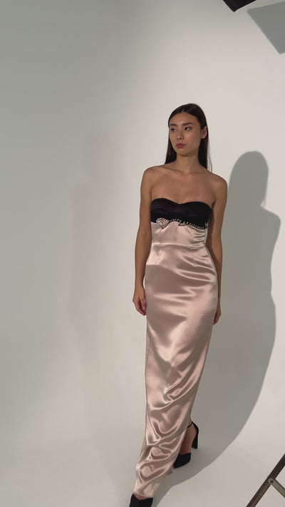 Curved neckline, adorned with a custom crystal tulip embroidery. Contrasting chiffon slim fit skirt for a soft glam with a back slit.