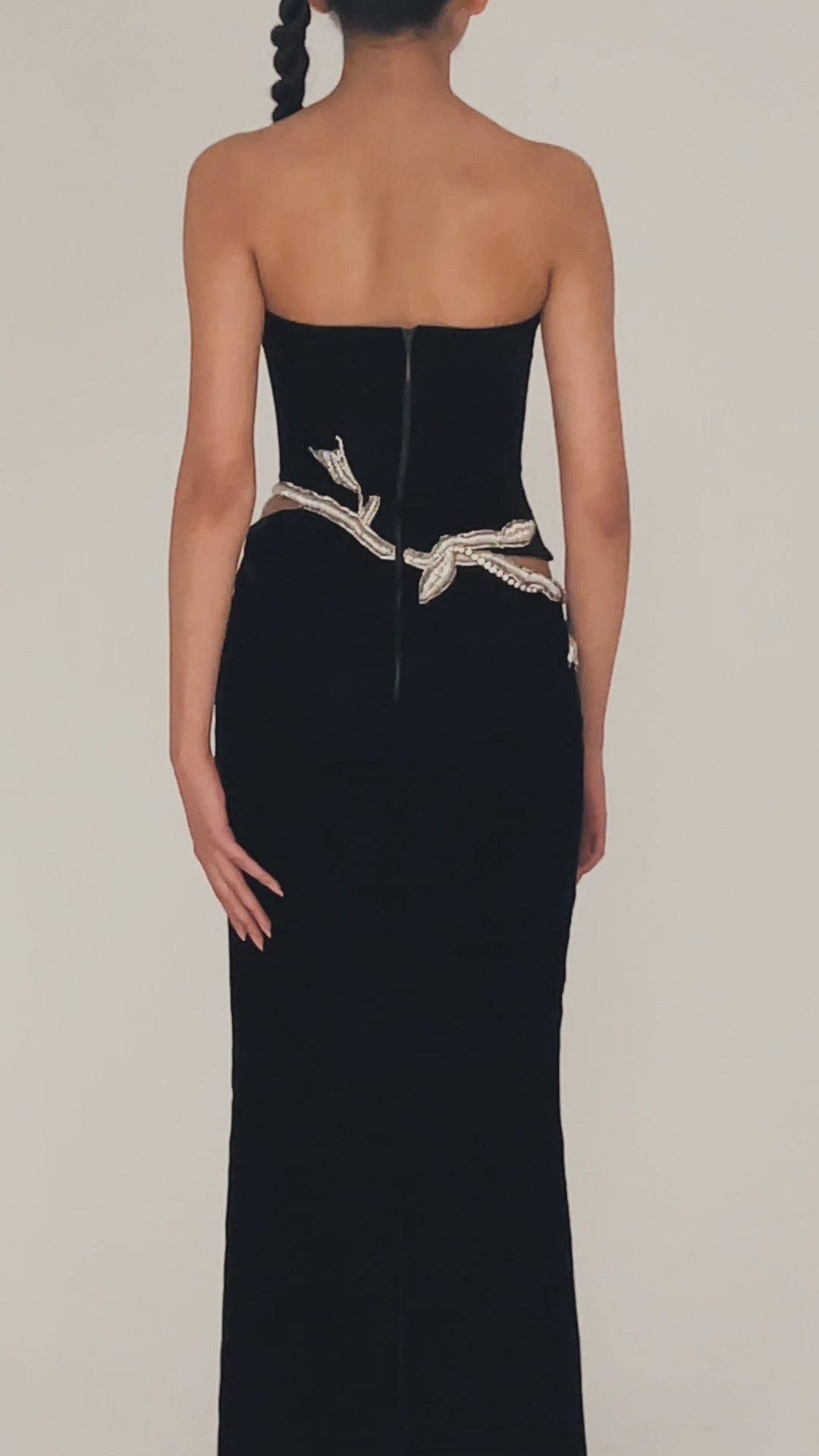 Velvet column dress with cut-outs at both hips and an edgy neckline. The skirt is slim with a slit at the back. Glammed with a custom intertwined raised vine crystal embroidery and Preciosa crystal chain.