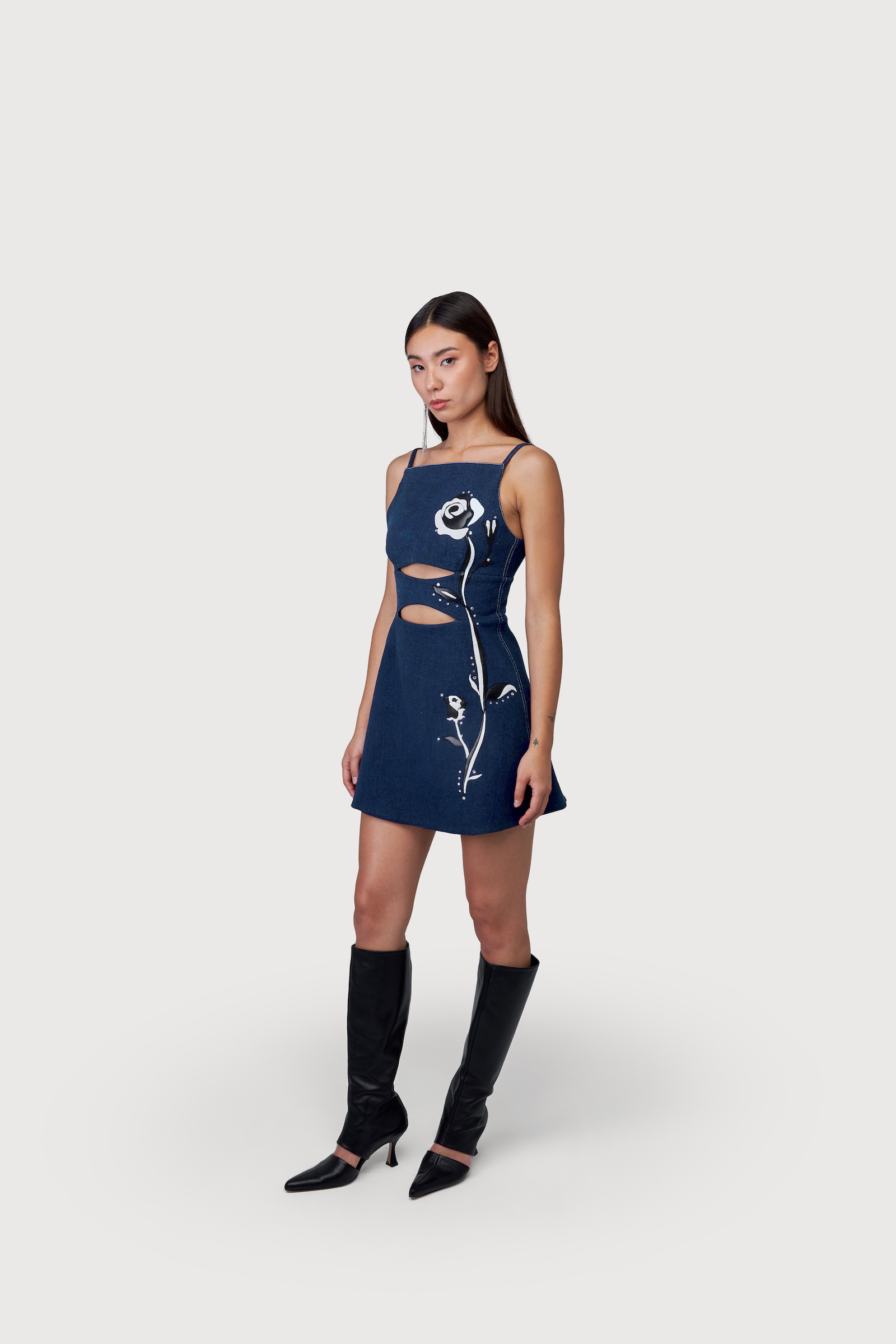 with backless adjustable string ties. Constructed with built in cups, cut out at the front. Velvet skirt with custom inverted floral appliqué leather motif.