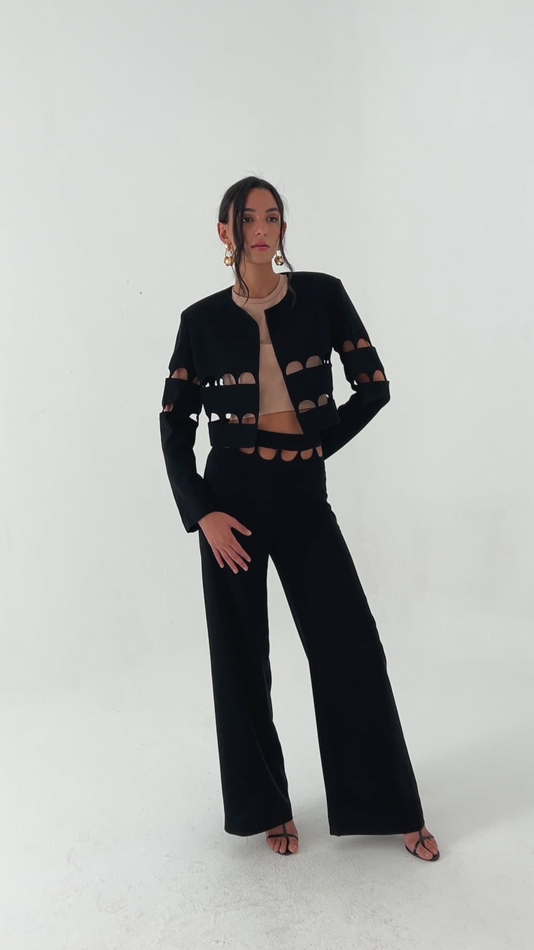 A tailored jacket with scallop cut outs on the bust, back and elbows.