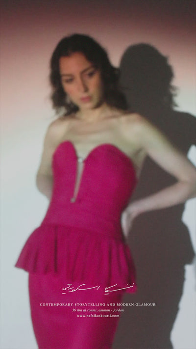 Chiffon corset with ruffle and a delicate crystal ribbon detail. The see-through deep heart-shape on the bust offers an elegant vibe to the top of the dress. The midi length bottom with matching Raspberry chiffon.
