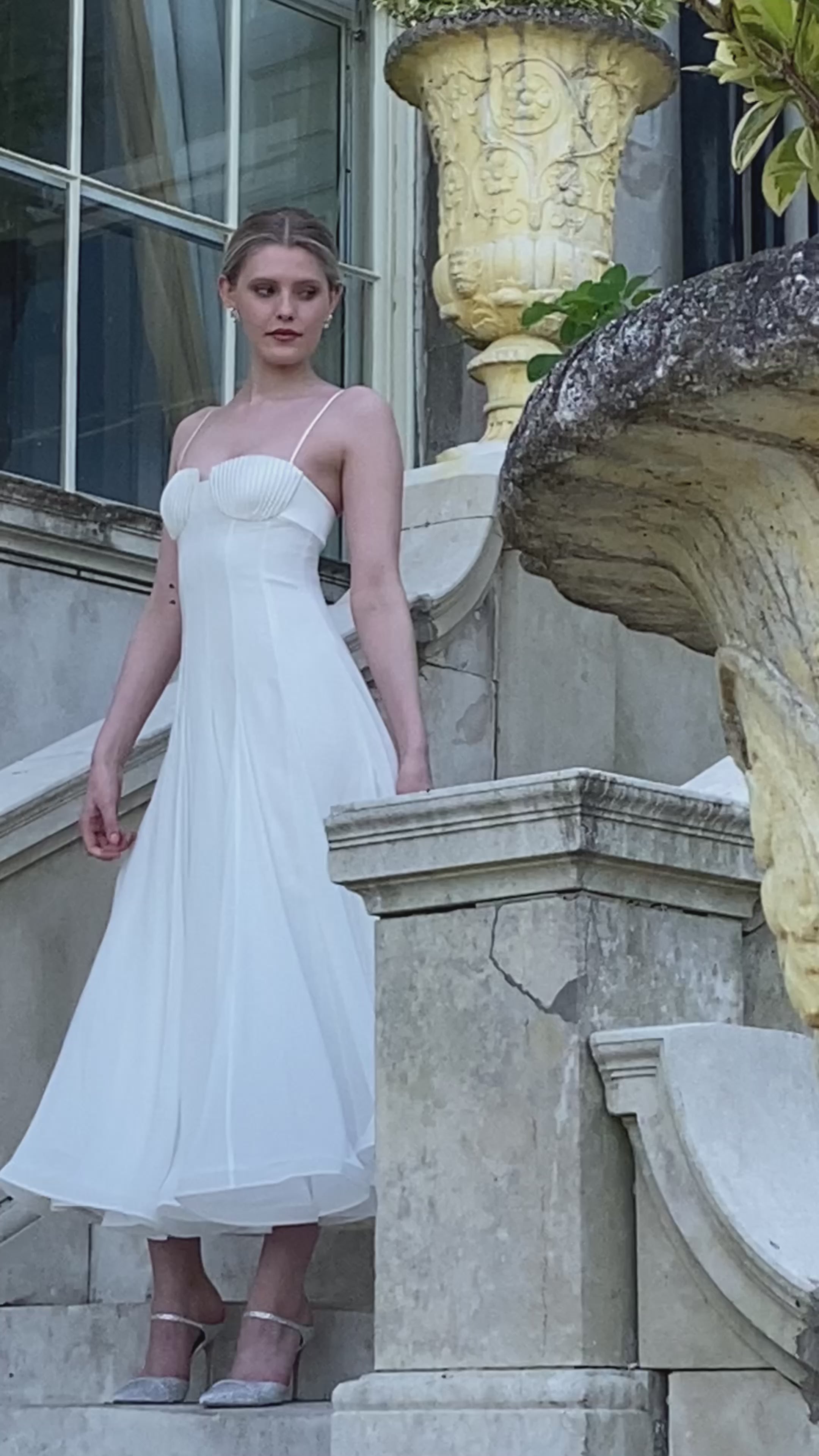 Our Bridal Waltz Gown captures high-octane bridal glamour. Cut from chiffon with satin cup detailing, it features a flowing midi A-line silhouette with delicate spaghetti straps. This dress was literally designed for dancing!