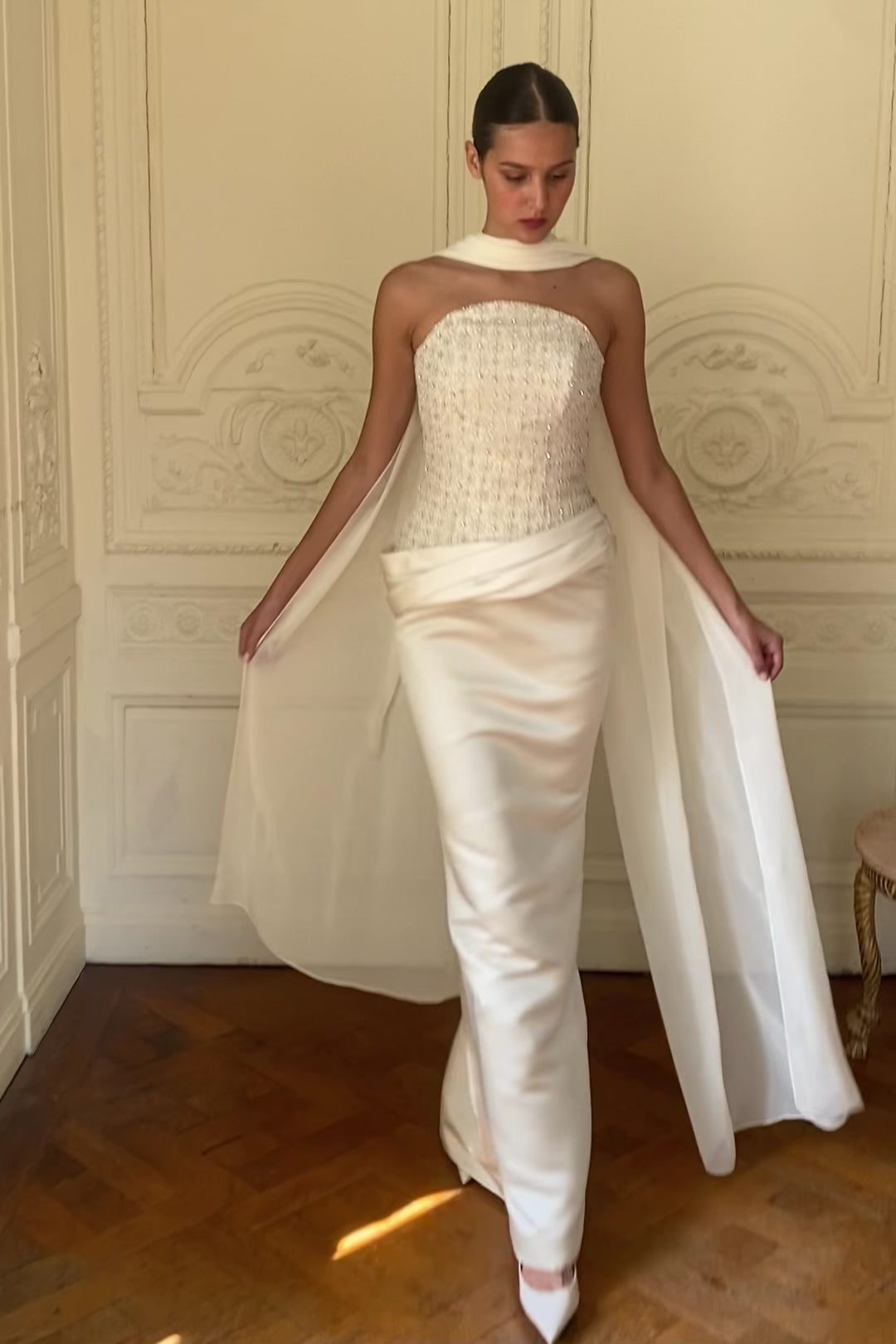 The Celeste Strapless Gown with our signature draping at the hip and strapless rounded neckline is made for the fashion forward bride. It’s cut from duchess satin with an embroidered bodice and pairs beautifully with our matching veil.