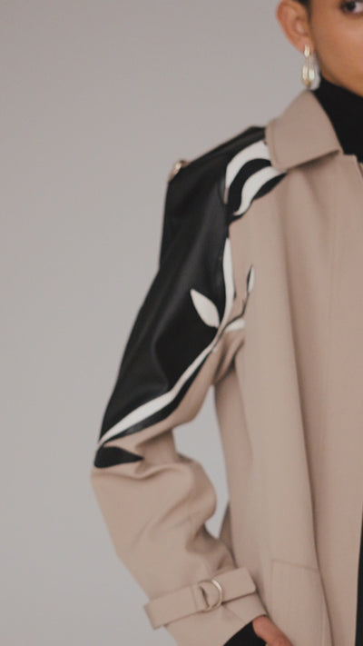 Trench coat with raglan sleeves and floral applique leather motif. Contrasting vegan leather panel at the sleeve. Adjustable straps at the shoulders, cuffs and back.