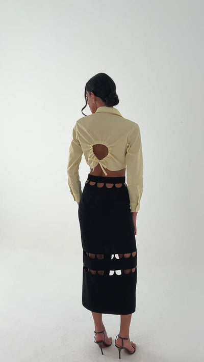 Cropped shirt with keyhole ruched drawstring at the back for a cinching effect.