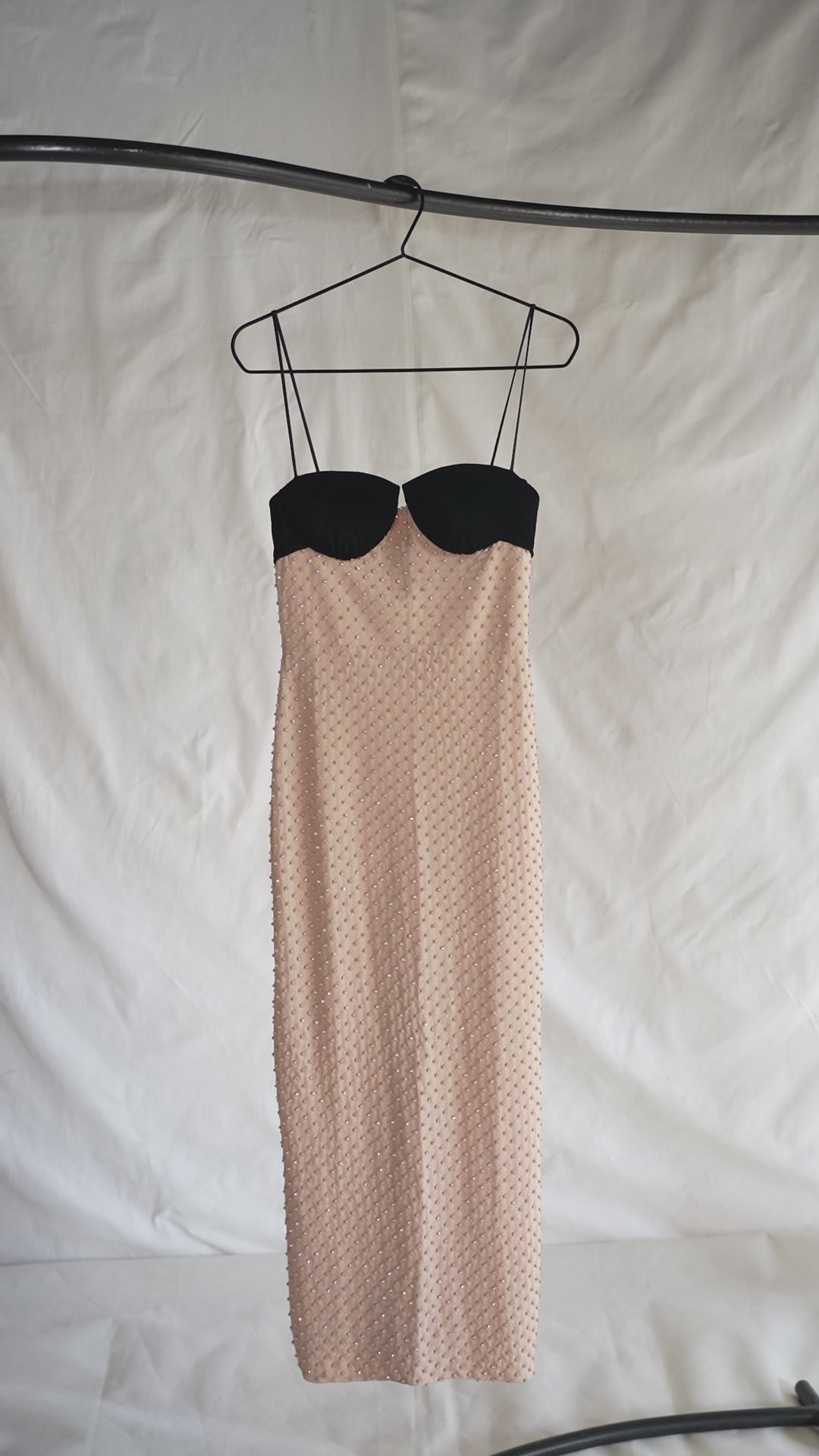 Slim-fit crystal embellished dress with contrasting velvet bust cups.