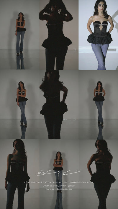 Elegant chic black corset with round cups and ruffles. The see-through diamond shape on the bust with a hand embroidered crystal line offer an elegant chic vibe to the top.
