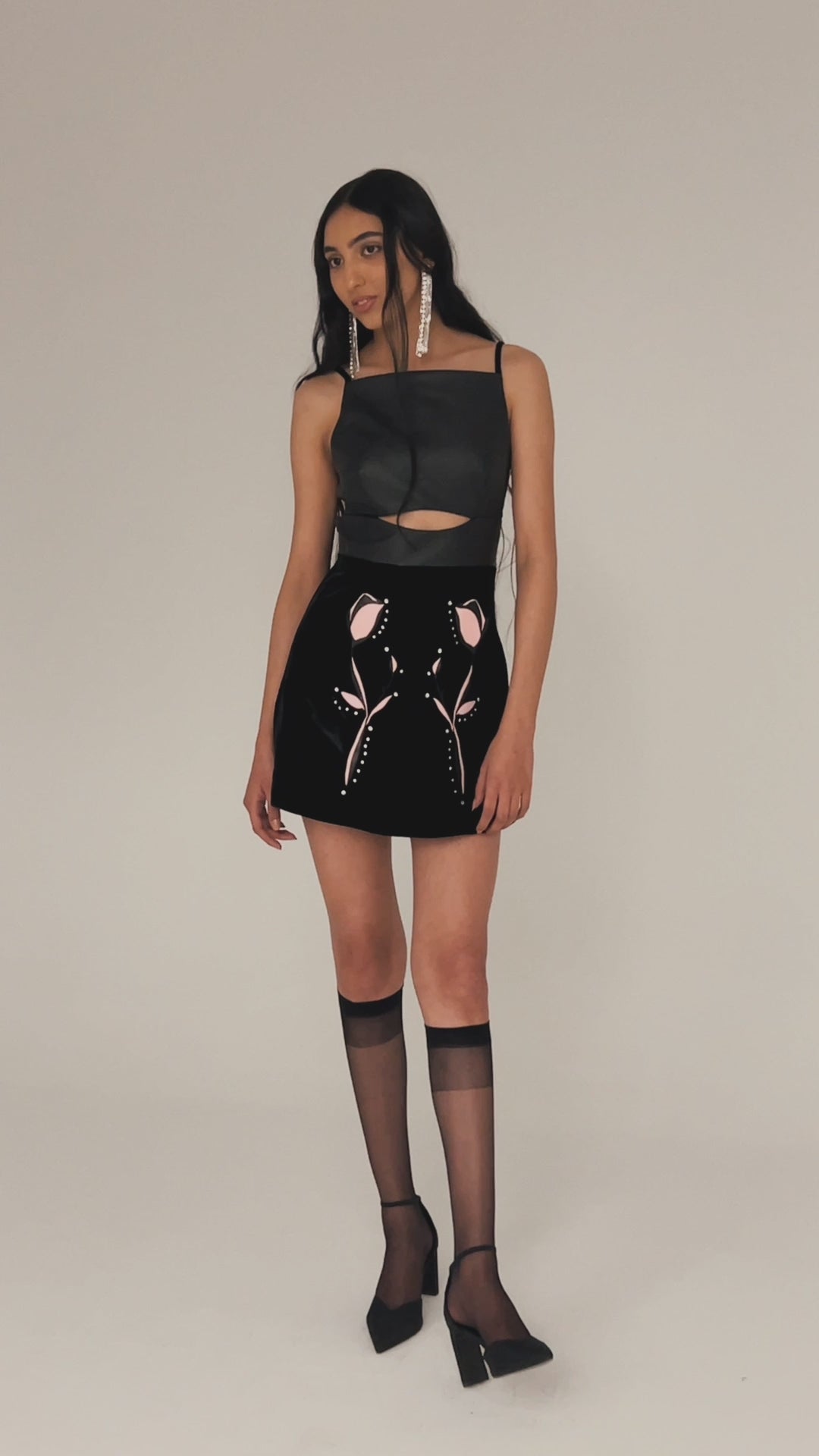 Mini dress with front cut-outs and handmade tulip leather applique on a velvet skirt.