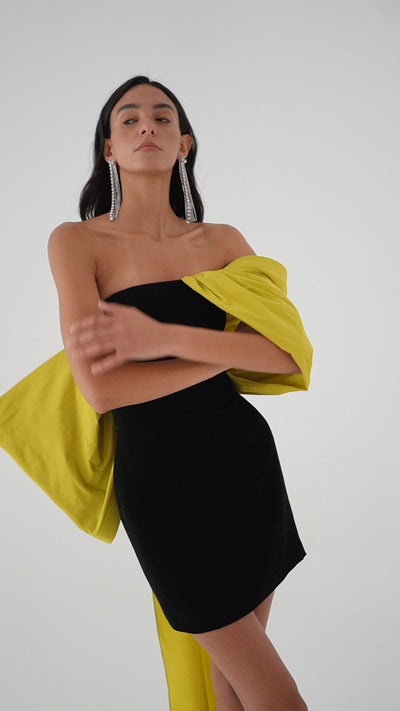 Strapless mini dress, featuring a one-shoulder mega drape that wraps around the back to meet its counterpart and drapes down.