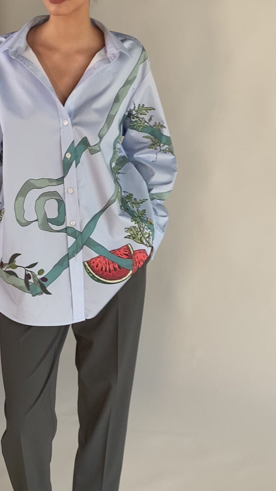 A relaxed-fit, oversized classic shirt. Made from crisp cotton poplin - with cascading ribbon prints in shades of green and watermelon and olive branch motifs. The front is adorned with the words "حُبِّي فِلَسْطِين" (My love Palestine) in velvet flock.