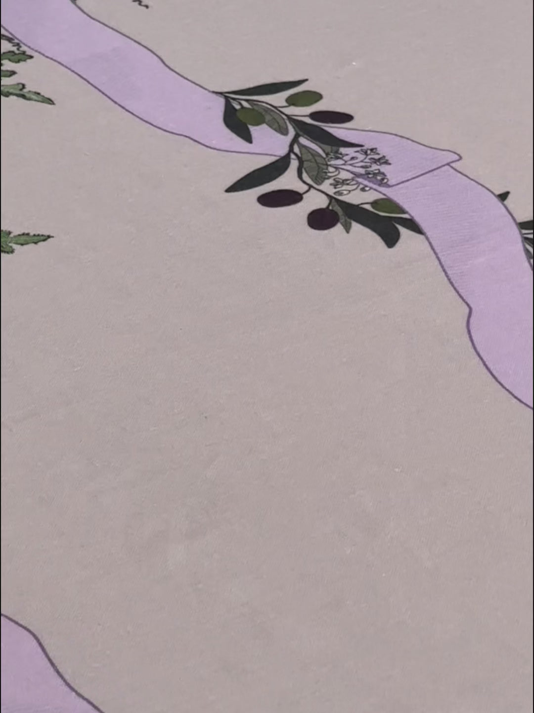 A pastel mauve tablecloth and napkins made out of 100% linen, with cascading ribbons in yellow, violet, maroon, and dusty rose, with the names of Palestinian cities. Adorned with motifs of olive branches, pine leaves, and watermelons. It comes with a set of x12 Napkins.