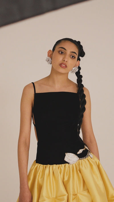The Eden Bloom is a signature NS silhouette. Featuring a drop waist bodice and high square neckline, and a voluminous ruched skirt, gathered skirt crafted from luxurious silk-blend taffeta.