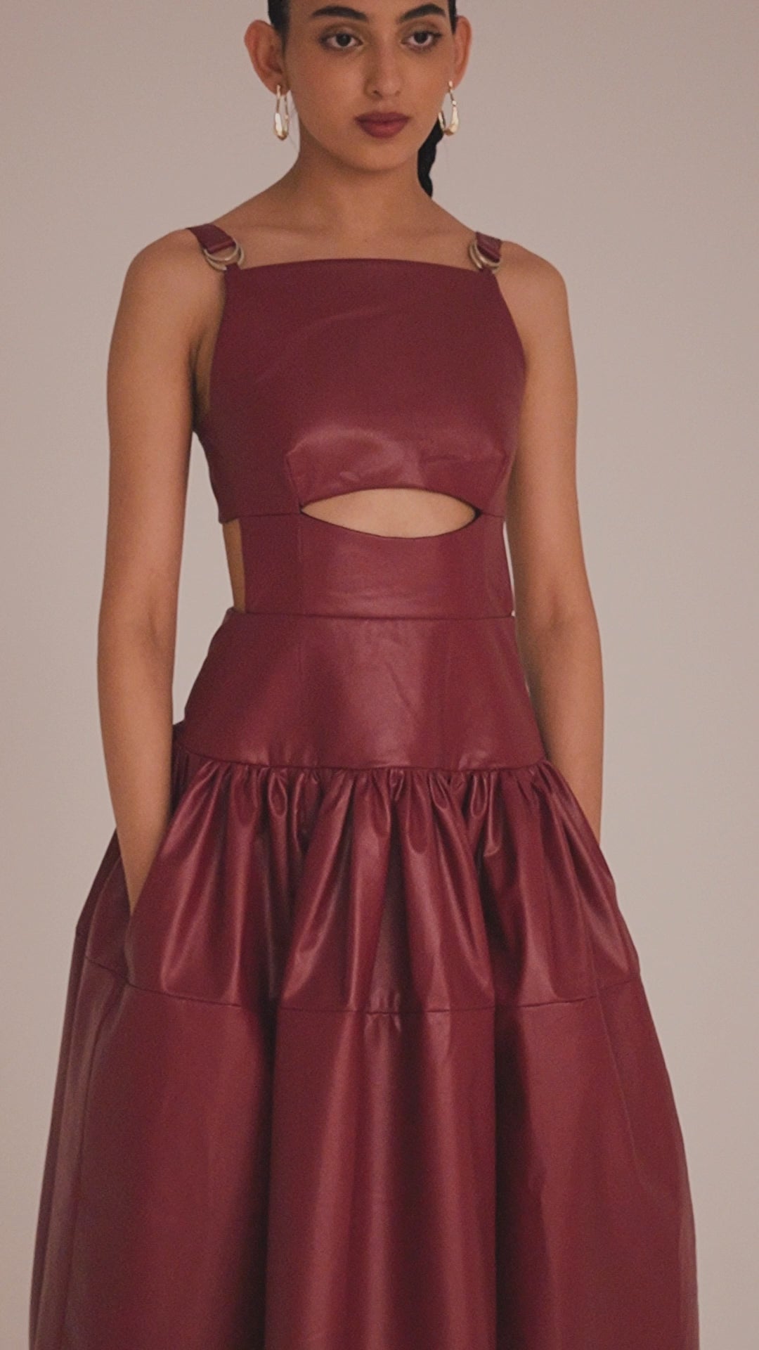 Square neckline and buckled straps. Edgy puffy and ruched skirt. Featuring under bust cut-out and pockets.