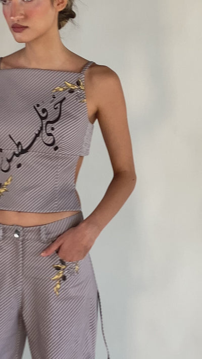 High-waisted wide-leg jeans with keep-back pockets. Featuring a custom print of olive branches and the words "حُبِّي فِلَسْطِين" (My love Palestine) emblazoned across the back. Matching item: Hobi Falasteen Leo top